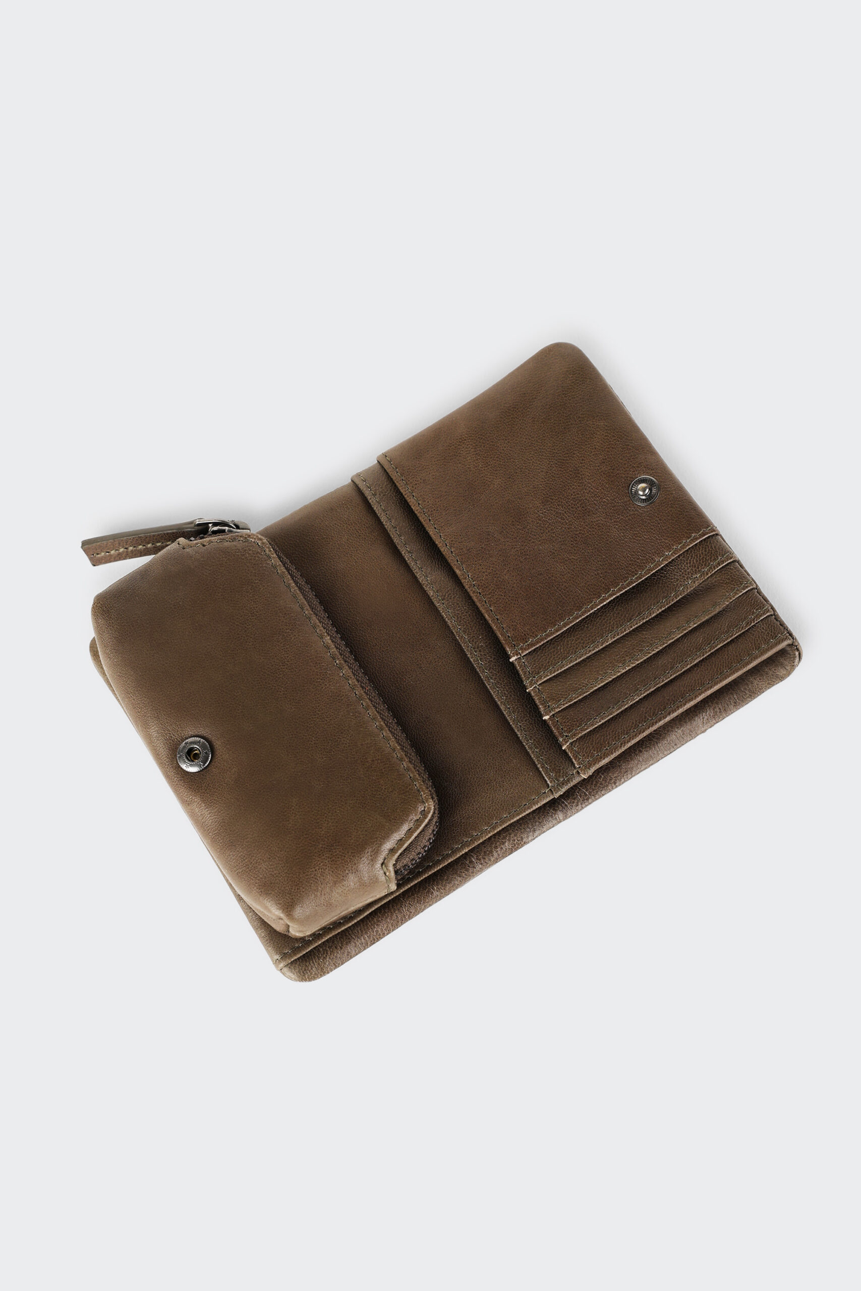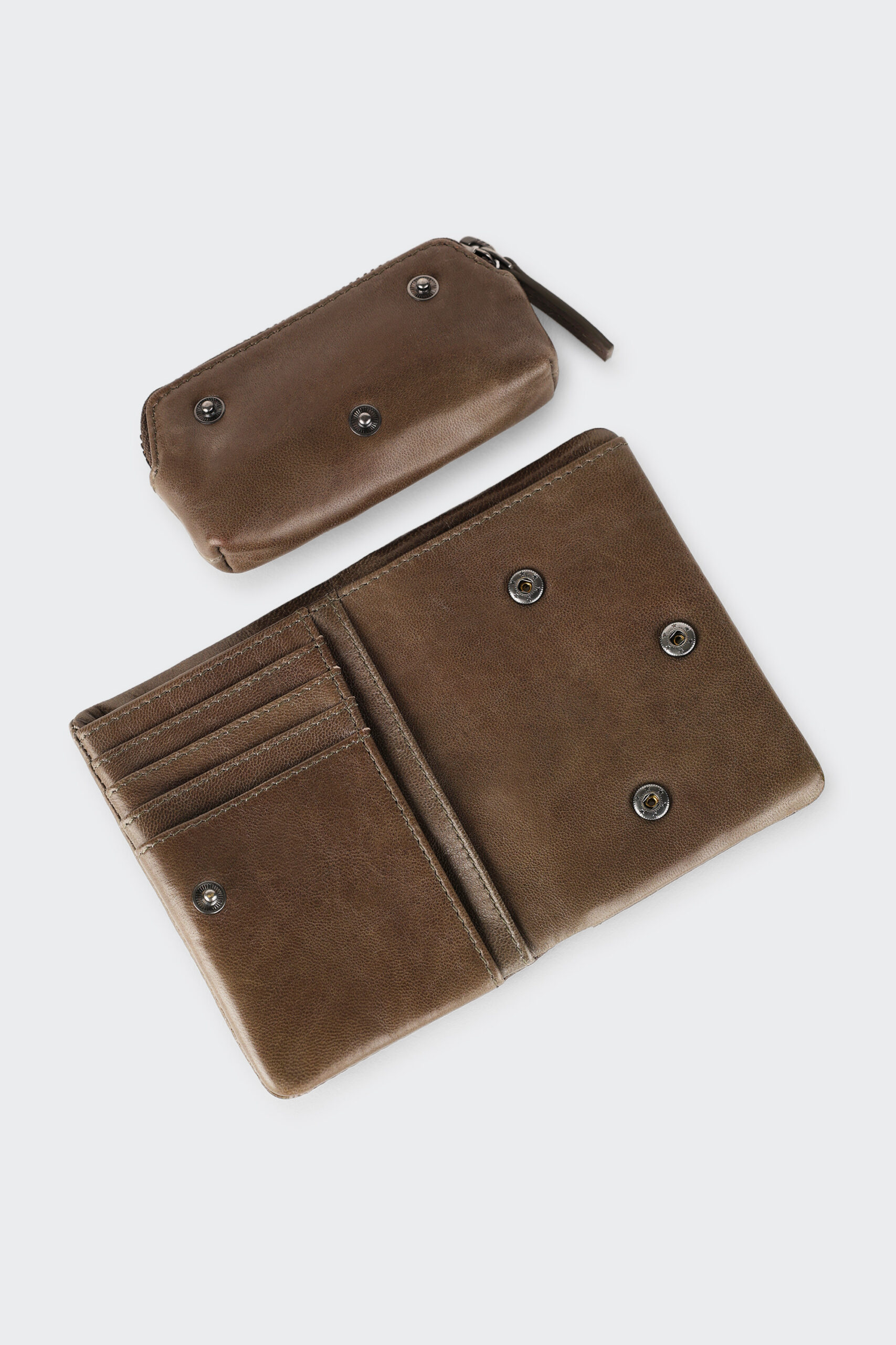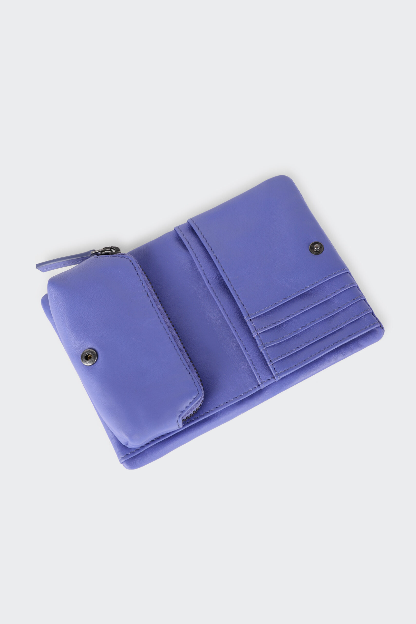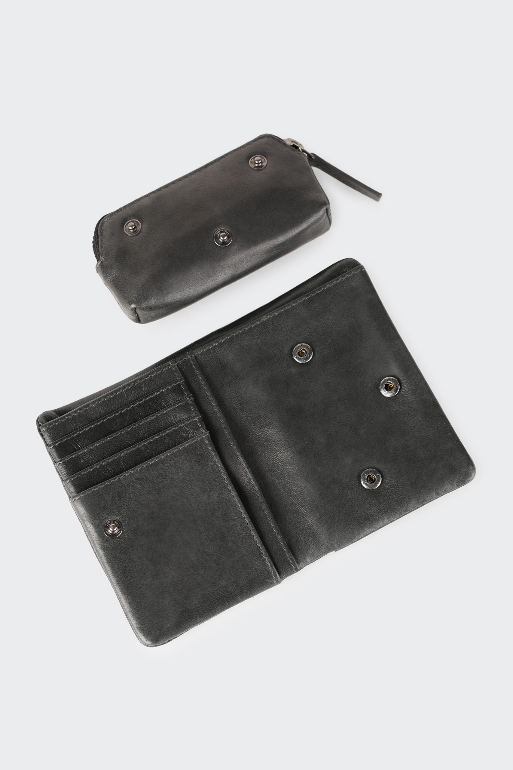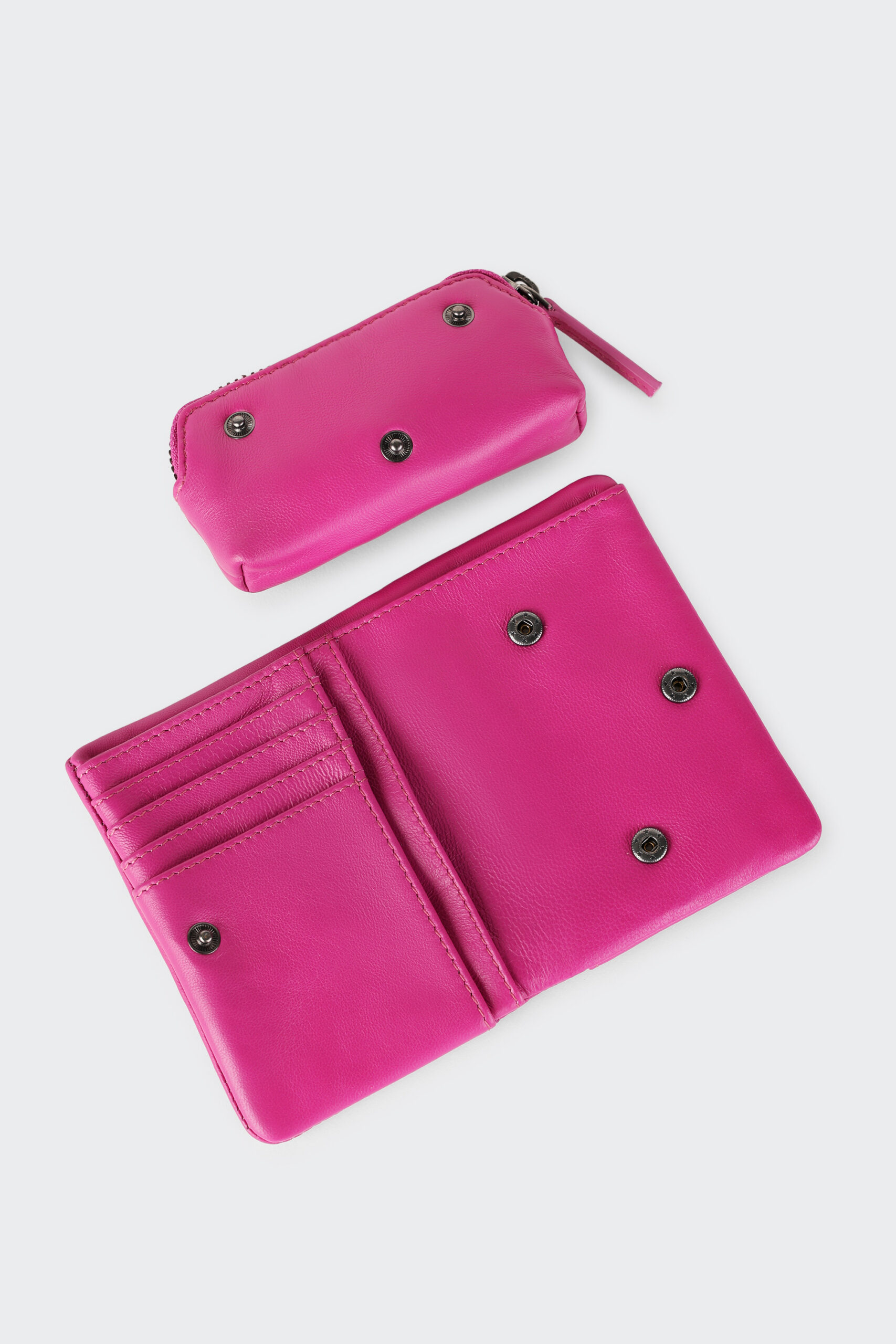 Le porte-monnaie est zippé et s’attache avec des boutons de pression.